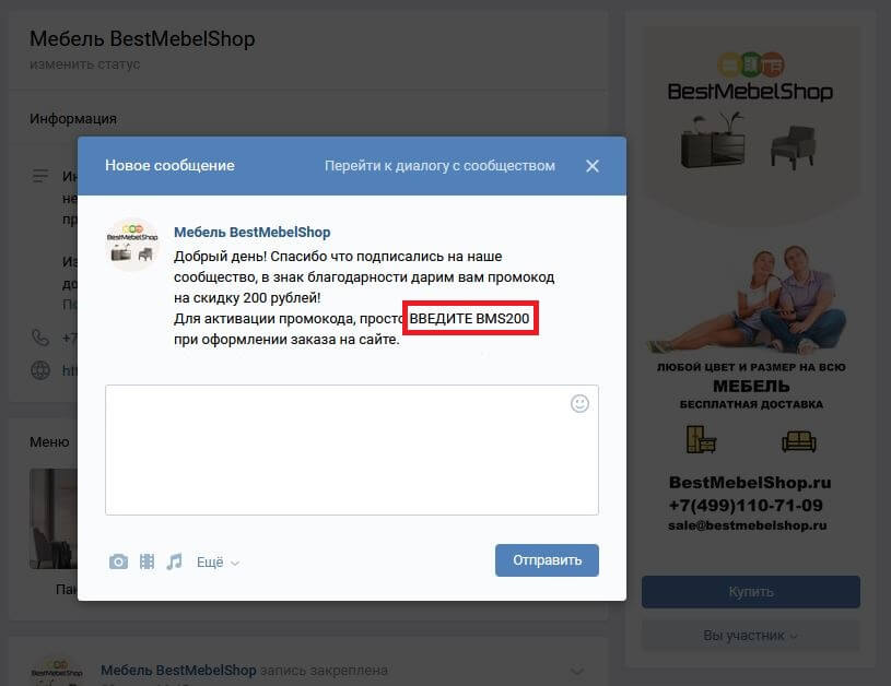 - В открывшемся диалоговом окне в ответном сообщении отобразится Ваш купон для заказа. Купон действует на каждое заказанное изделие и дает скидку до 200 рублей.