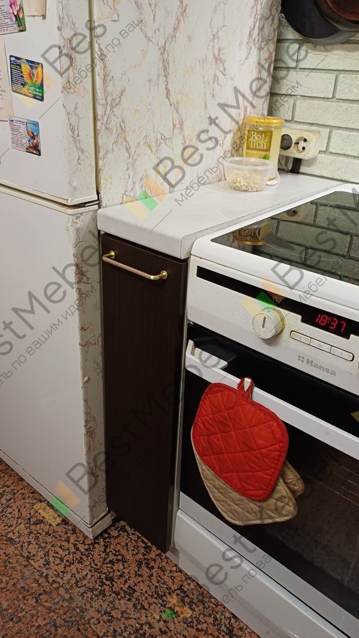 Заказывала в дополнение к кухне София, нужно было добавить узкий нестандартный шкафчик в небольшой промежуток. Получилось просто идеально, бутылочница встала как «доктор прописал».