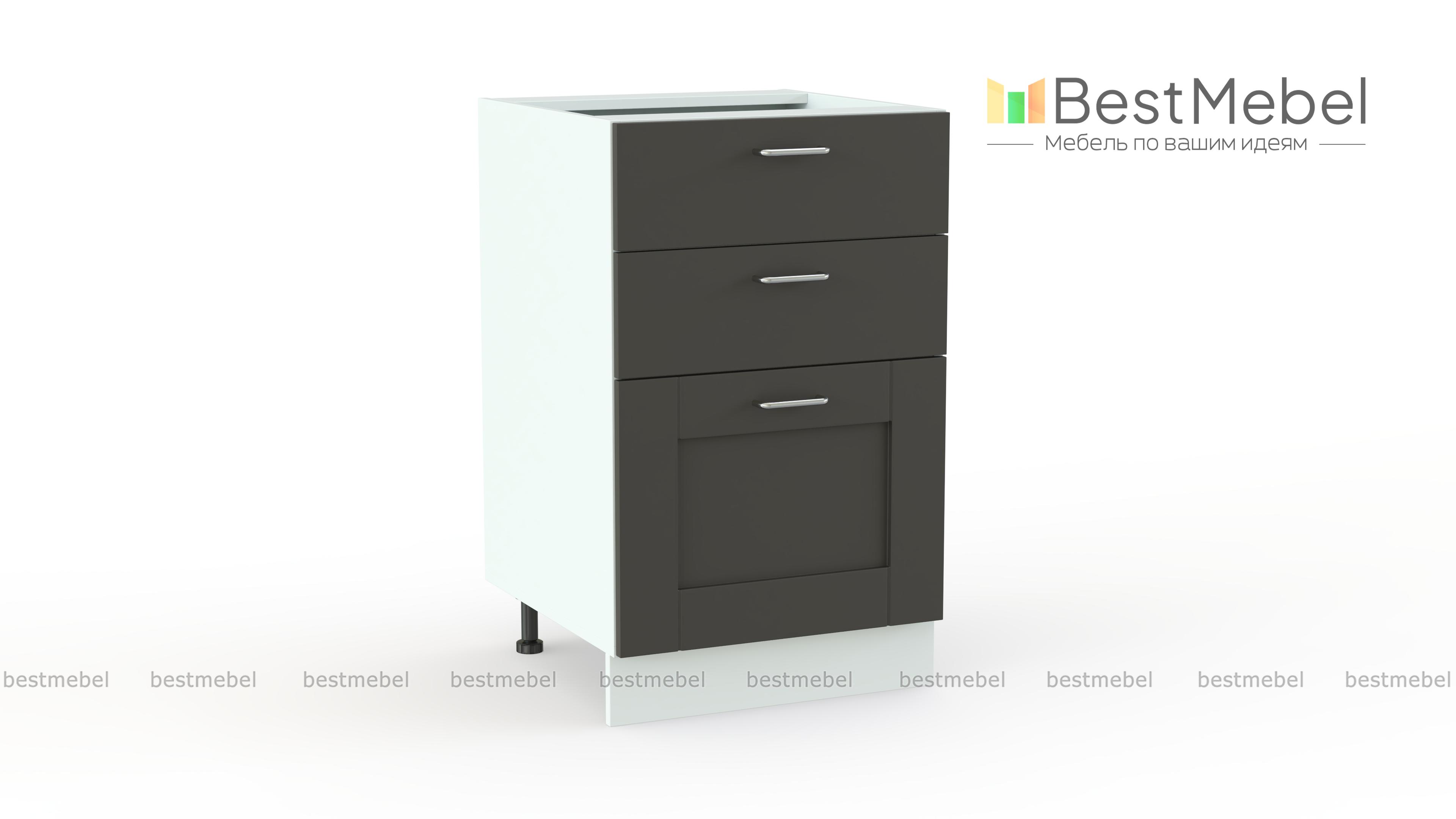 Шкаф нижний с 3-мя ящиками Лофт BMS поможет систематизировать хранение мелочей и сократить время на поиски нужной вещи. Шкаф выполнен в современном стиле и дополнит нижний ряд модулей кухонного гарнитура. Широкая модель оборудована тремя выдвижными ящиками разной высоты, в которых без труда разместится все необходимое. Фасады в матовом графитовом оттенке декорированы массивными ручками. Купить шкаф нижний с 3-мя ящиками Лофт BMS по демократичной цене вы сможете в нашем интернет-магазине.