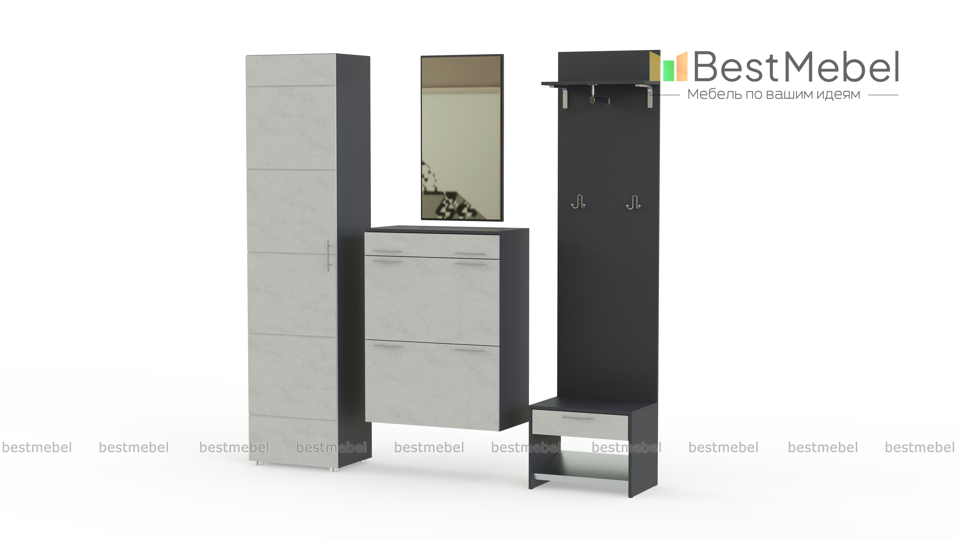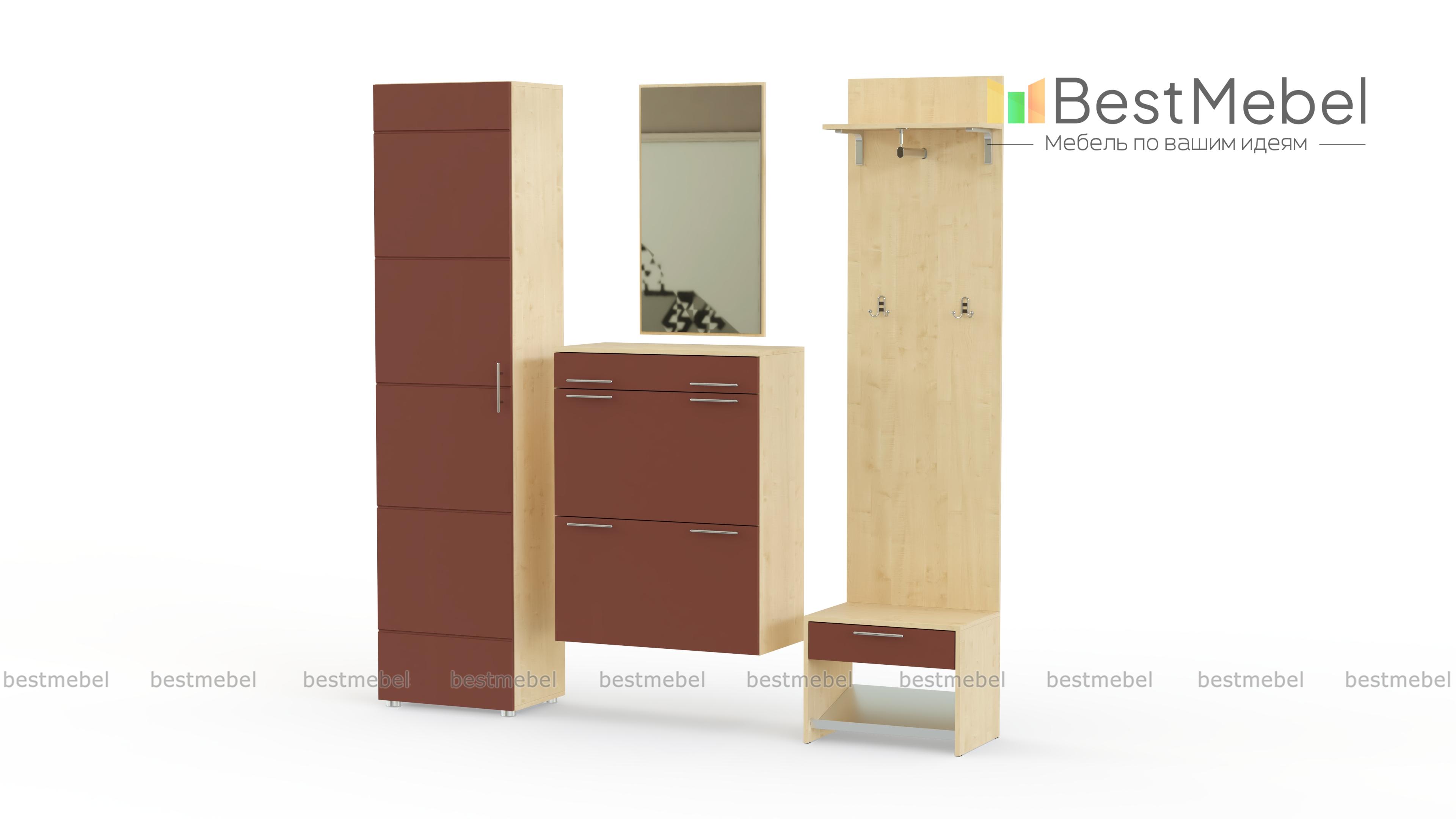 Гарнитур для прихожей состоящий из пяти частей не только вместительный, но и прекрасный конструктор для создания индивидуального интерьера. Каждая часть независима от других, можно менять местами оставив в понравившемся порядке, в зависимости от свободного пространства можно регулировать компактность конструкции.