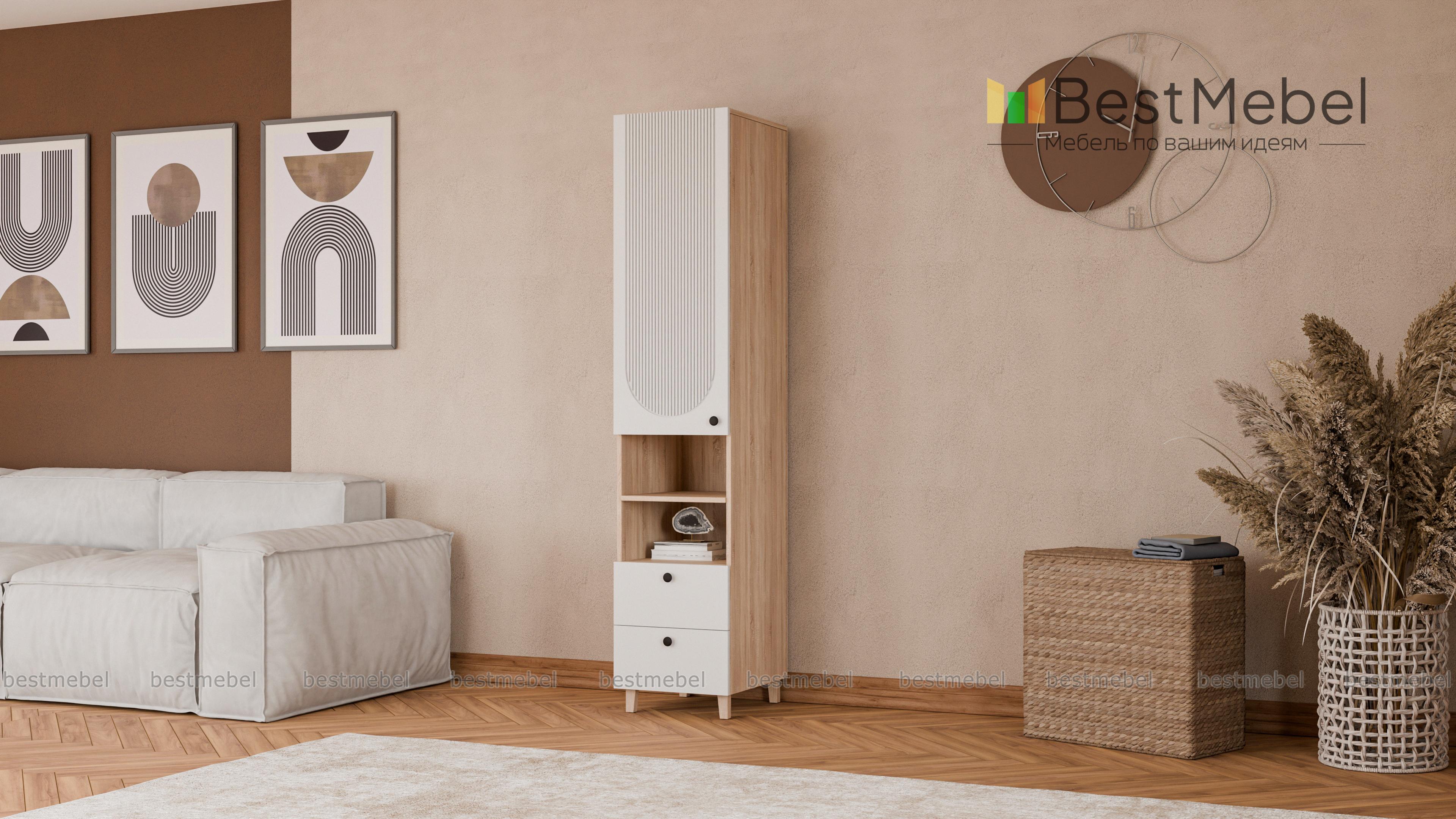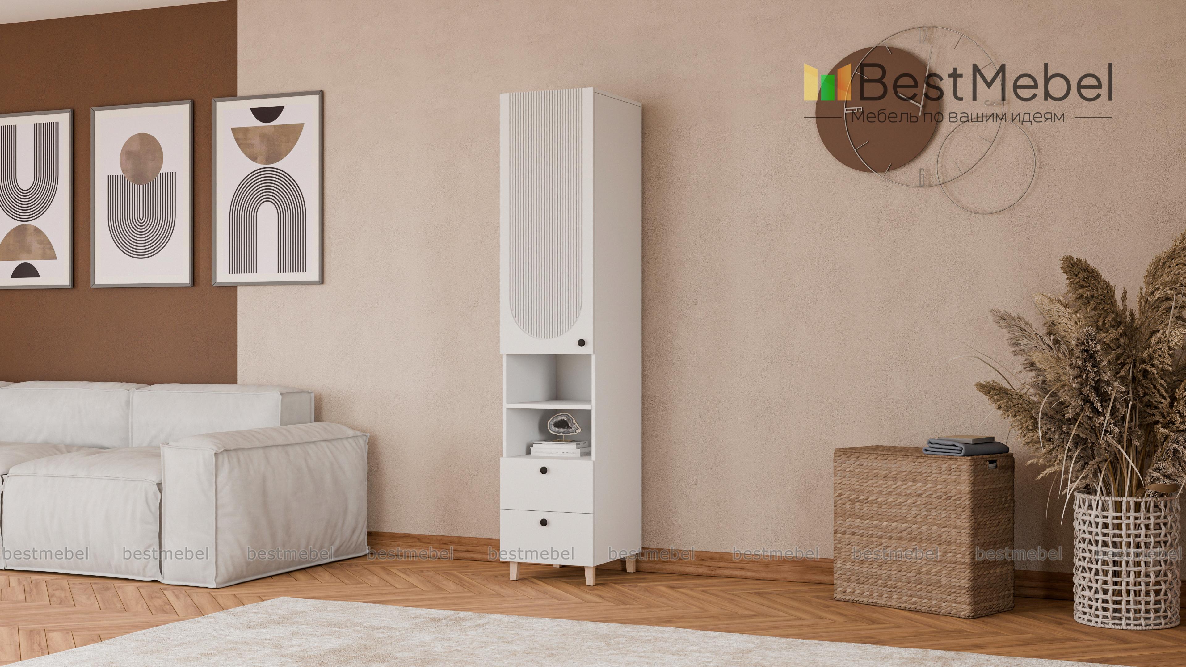 Шкаф-пенал Рене 4 BMS вместителен и легко вписывается в ограниченное пространство небольшой квартиры. На удобной высоте располагаются закрытое отделение, полки для необходимых в быстром доступе вещей и два выдвижных ящика. Установленный на высокие ножки, пенал облегчает уборку, а рифленый фасад из МДФ не только стильно выглядит, но и легко очищается от загрязнений. Купить шкаф-пенал Рене 4 BMS в оттенках нашего каталога и необходимом размере вы сможете на сайте интернет-магазина.