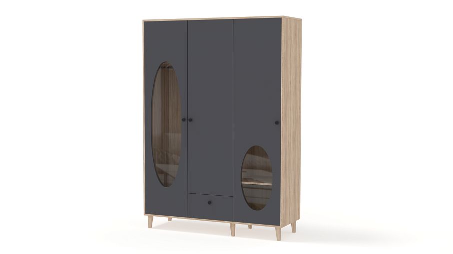 Шкаф распашной Брукс 2 BMS с высокими деревянными ножками не только сохранит вещи в порядке, но и придаст индивидуальность интерьеру. Трехдверный гардероб для спальни или детской оборудован двумя отделениями для хранения одежды, а внизу предусмотрен выдвижной ящик под мелкий трикотаж. Необычное дизайнерское решение — большие овальные вырезы со стеклом на дверцах. Купить шкаф распашной Брукс 2 BMS, изготовленный по индивидуальным размерам, вы сможете на сайте нашего интернет-магазина.