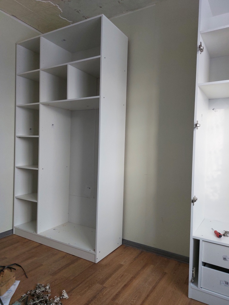 Шкаф качественный, вместительный. Порадовала возможность моделировать размеры.К сожалению, есть и недочёты: во-первых, малопонятная инструкция по сборке(она есть на фото, это всё, один лист с общей схемой)- собирали шкаф сами, и несколько раз приходилось переделывать отдельные моменты, потому что в инструкции нет пошаговой схемы.Во-вторых, зеркало на дверь. В первый раз, не подумав, прикрутили ручку прямо к стеклу (никаких прокладок в комплекте не идет)- в результате стекло сильно треснуло ещё на этапе сборки. Перезаказали дверь (с доплатой), спасибо отделу гарантий, вопрос решили очень быстро! Но и со второй дверью получилось не очень- купили специальные прокладки, дверь повесили, но она сама дала трещину (на фото можно увидеть). Радует, что не критично, пока будет так. Но покупателям советую или не брать зеркальную дверь вообще, или купить такой вариант, чтобы ручка монтировалась на дерево, потому что замена вам в некоторю сумму обойдётся. А так шкаф сам по себе очень хороший, и сервис тоже!