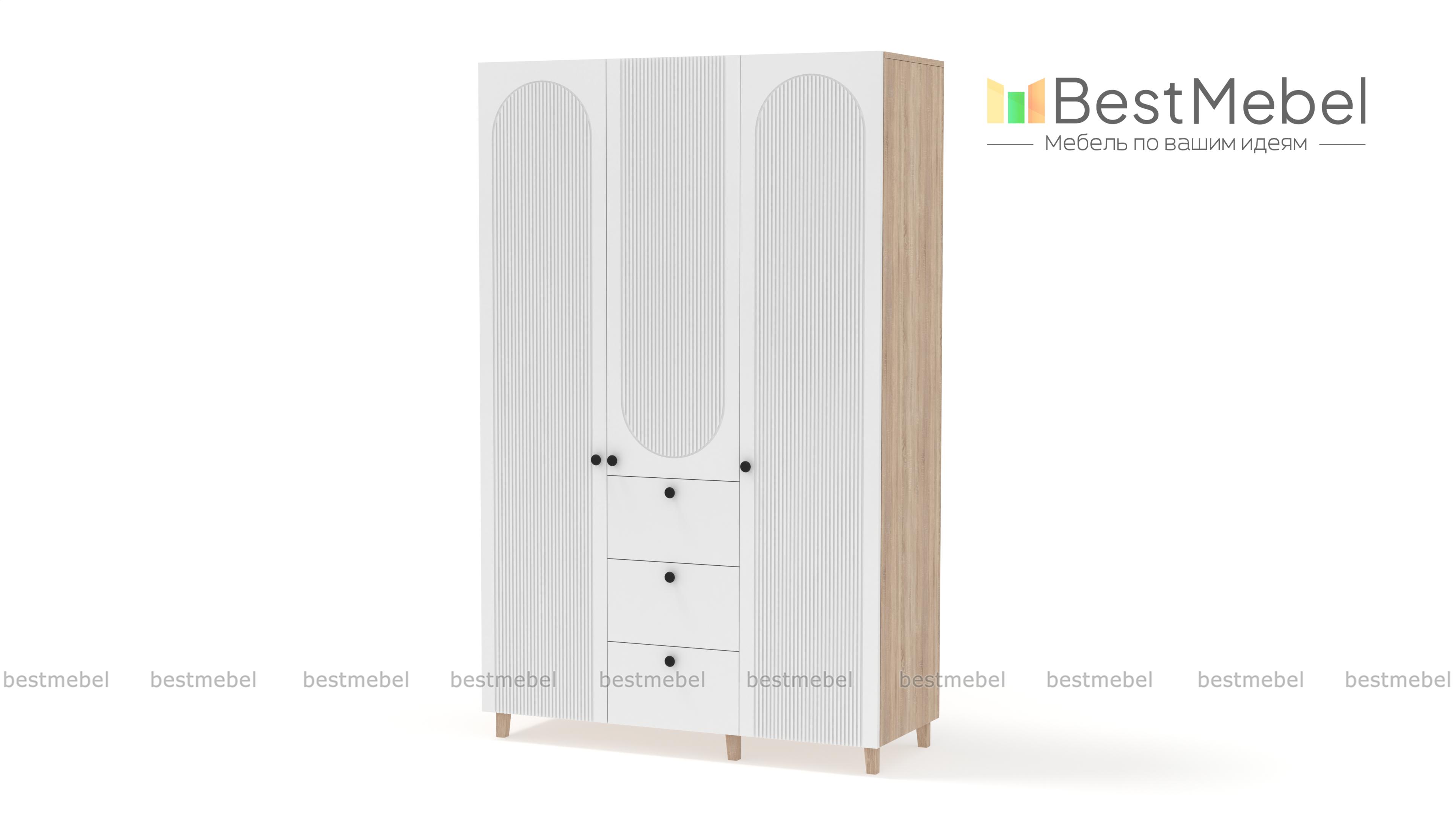 Шкаф распашной Рене 22 BMS с высокими ножками прекрасно подходит для меблировки спален, прихожих и гостиных. Помимо распашных отделений для белья и одежды трехдверный шкаф оборудован рядом из трех выдвижных ящиков, предназначенных для мелочей. На стильном темном фасаде из МДФ — оригинальный рельеф и миниатюрные круглые ручки. Купить шкаф распашной Рене 22 BMS в оттенках из нашего каталога и необходимом размере вы сможете недорого на сайте интернет-магазина.