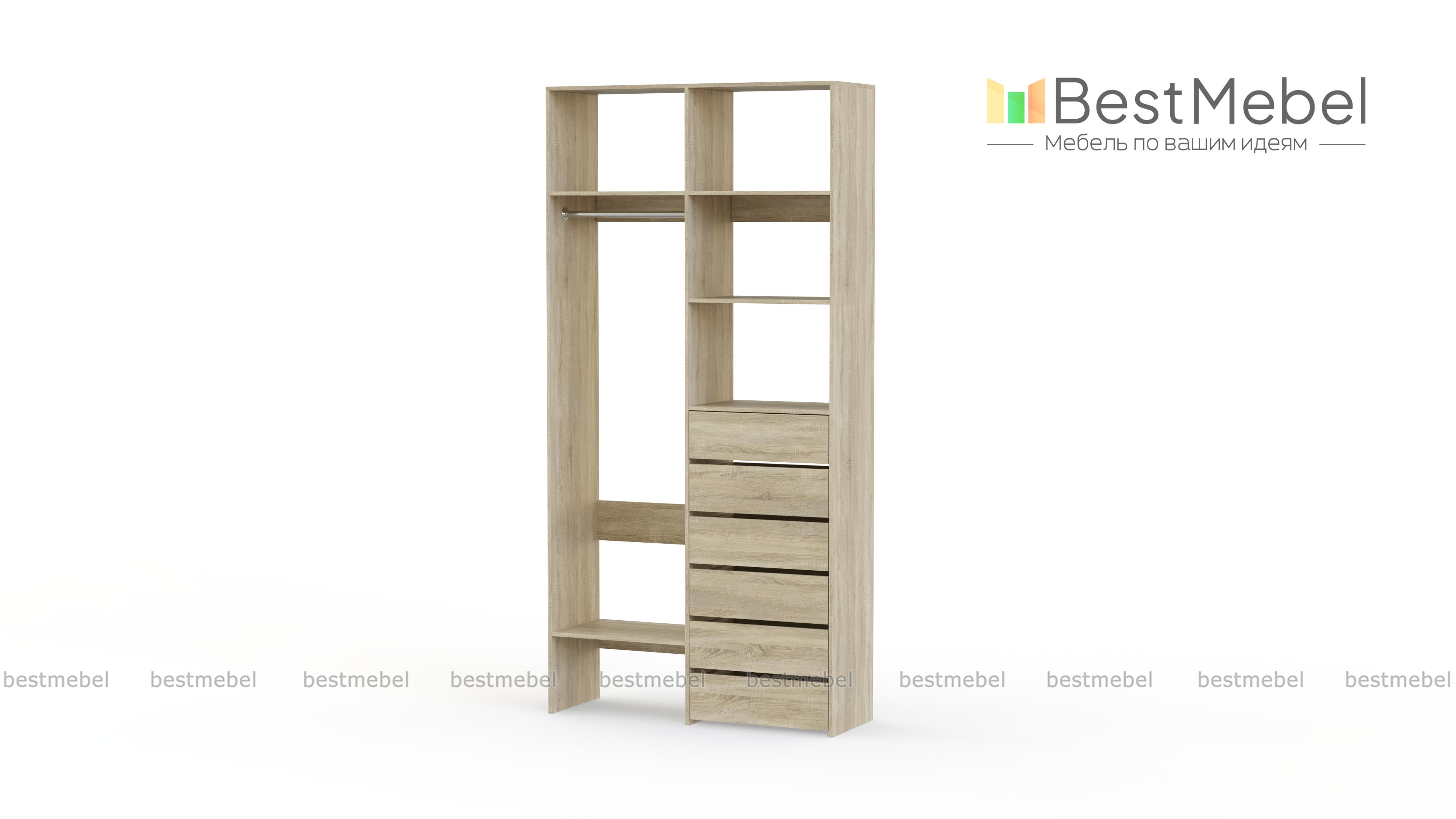 Стеллаж для одежды Мирта 38 BMS включает в себя разноплановые отделения для максимально удобного хранения. Платяное отделение слева и ряд из шести выдвижных ящиков справа дополнены вместительными бельевыми полками. Благодаря изготовлению из ламинированной ДСП стеллаж доступен по цене, прост в уходе и имеет широкую цветовую палитру. Купить стеллаж для одежды Мирта 38 BMS в необходимом вам размере и цвете вы всегда сможете на сайте нашего интернет-магазина.