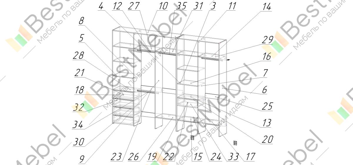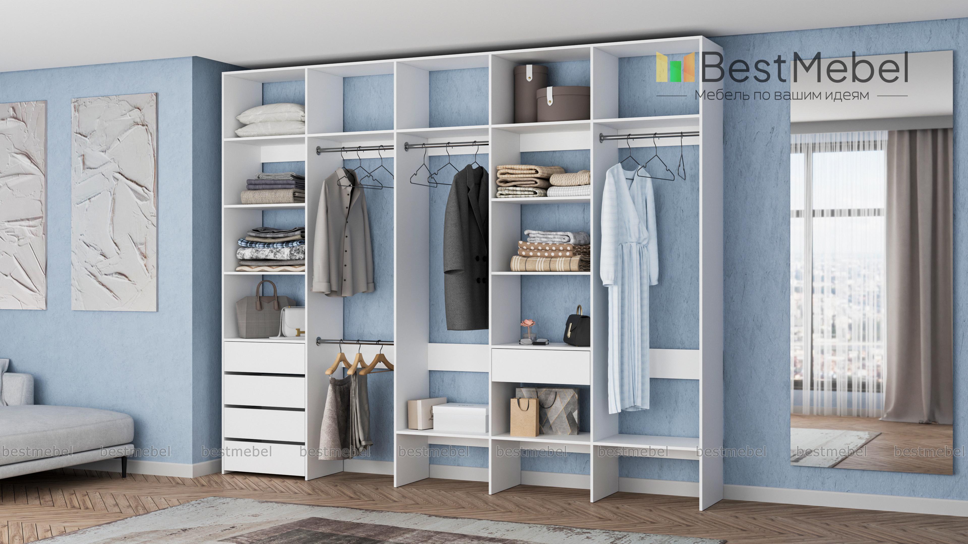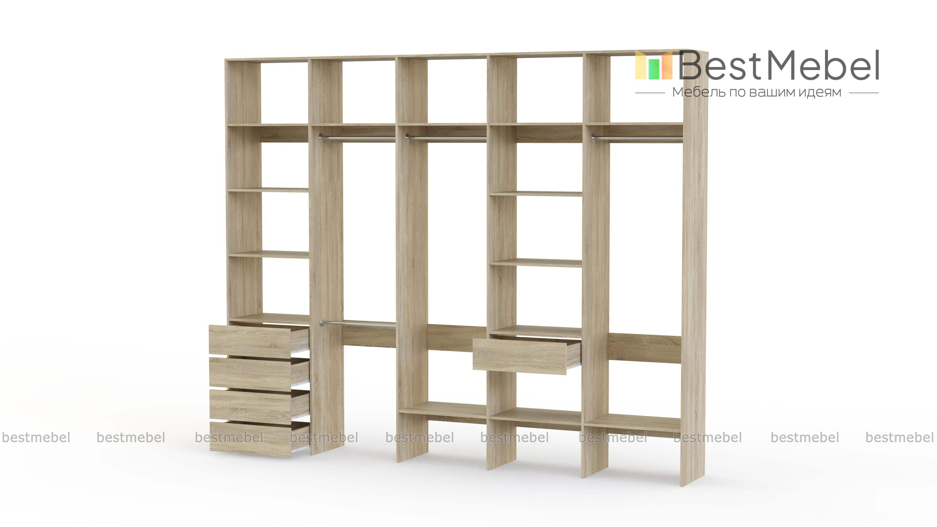 Стеллаж для одежды Мирта 73 BMS удобно зонирует пространство для хранения. Четыре штанги и полки позволят рассортировать одежду по категориям, расположенные на нижнем уровне полки удобны для создания обувниц, а в ящики можно убрать аксессуары, белье и другие мелочи. Дизайн стеллажа лаконичен и универсален, а поверхности из ламинированной ДСП устойчивы к влаге и появлению царапин. Купить стеллаж для одежды Мирта 73 BMS, изготовленный по вашим размерам, вы сможете в нашем интернет-магазине.