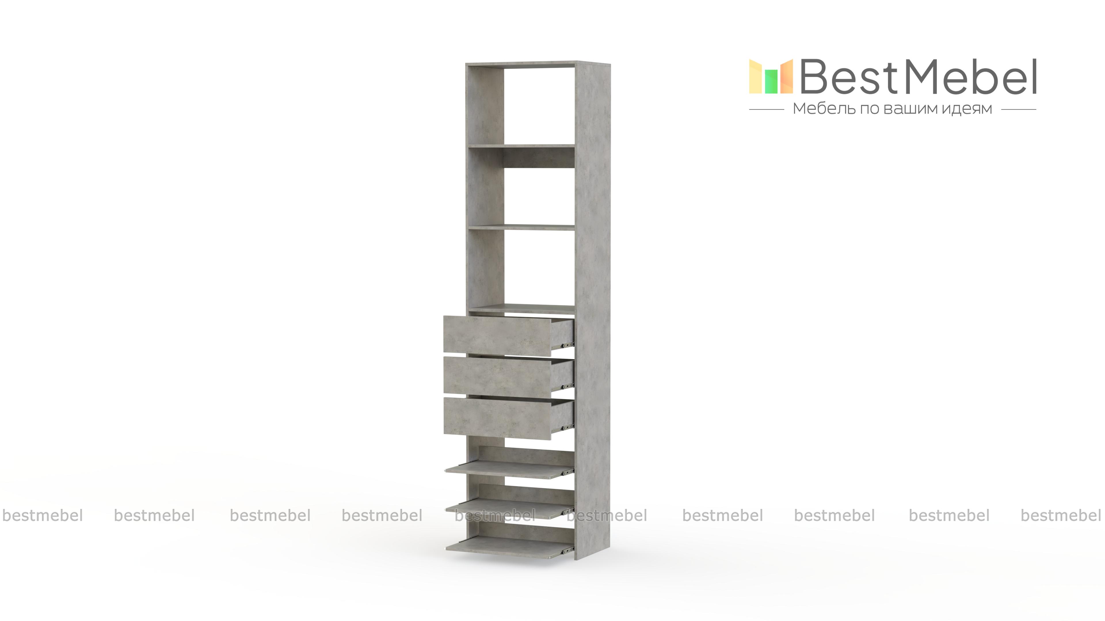 Стеллаж для одежды Мирта 77 BMS дополнит гардеробную систему или станет самостоятельным предметом меблировки. Односекционная модель оборудована тремя ящиками, стационарными и выдвигающимися полками для хранения одежды в сложенном виде, мелкого трикотажа, обуви и аксессуаров. Ламинированные поверхности влагостойкие и не требуют сложного ухода. Купить стеллаж для одежды Мирта 77 BMS, подобрав размеры и цвет под свой интерьер, можно на сайте нашего интернет-магазина.