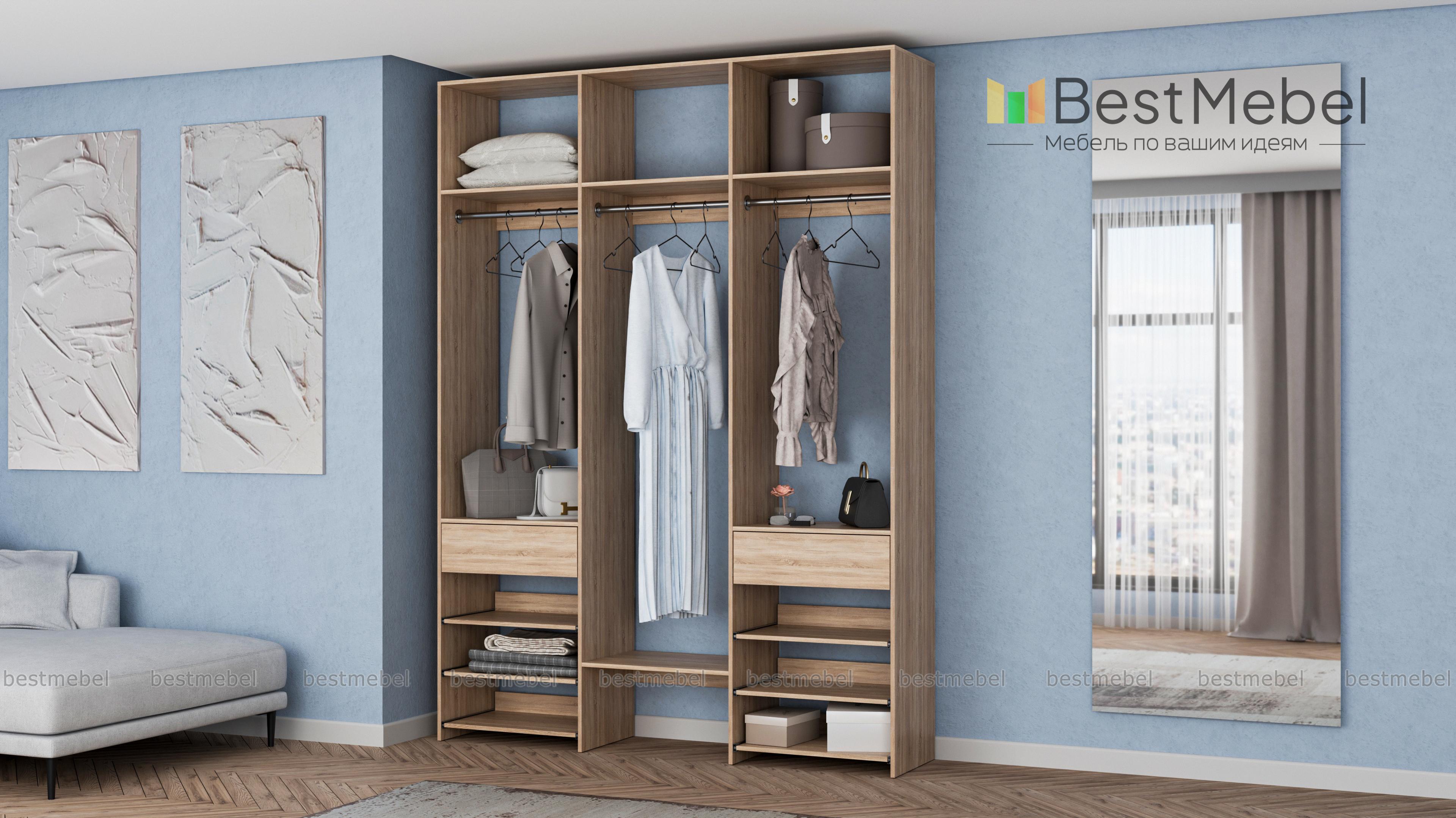 Стеллаж для одежды Мирта 91 BMS позволяет разместить вещи на виду и в легком доступе. Для хранения короткой и длинной одежды на вешалках, сложенных вещей, мелкого трикотажа и обуви идеально подходит комбинация из трех штанг, верхних полок, выдвижных панелей и пары ящиков. Стеллаж из ламинированной ДСП с древесным рисунком прочный и эстетичный, при этом доступный по цене. Купить стеллаж для одежды Мирта 91 BMS в любом оттенке из каталога и нужном размере приглашаем к нам в интернет-магазин.