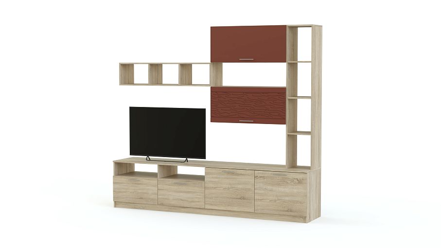 Стенка Вельвет 2 BMS из серии современных модульных комплектов выполнена в характерном сочетании древесных тонов и терракотового оттенка. Скромные размеры стенки отлично впишутся в малогабаритные квартиры и студии, а лаконичный дизайн не будет перегружать помещение лишними деталями. Разместить ТВ, книги, предметы декора и разнообразные мелочи помогут практичные модули – широкая низкая тумба, мини-стеллаж, одна открытая и две закрытые навесные полки. Интересный акцент – модный фрезерованный рисунок. Купить стенку Вельвет 2 BMS вы всегда сможете в нашем интернет-магазине.
