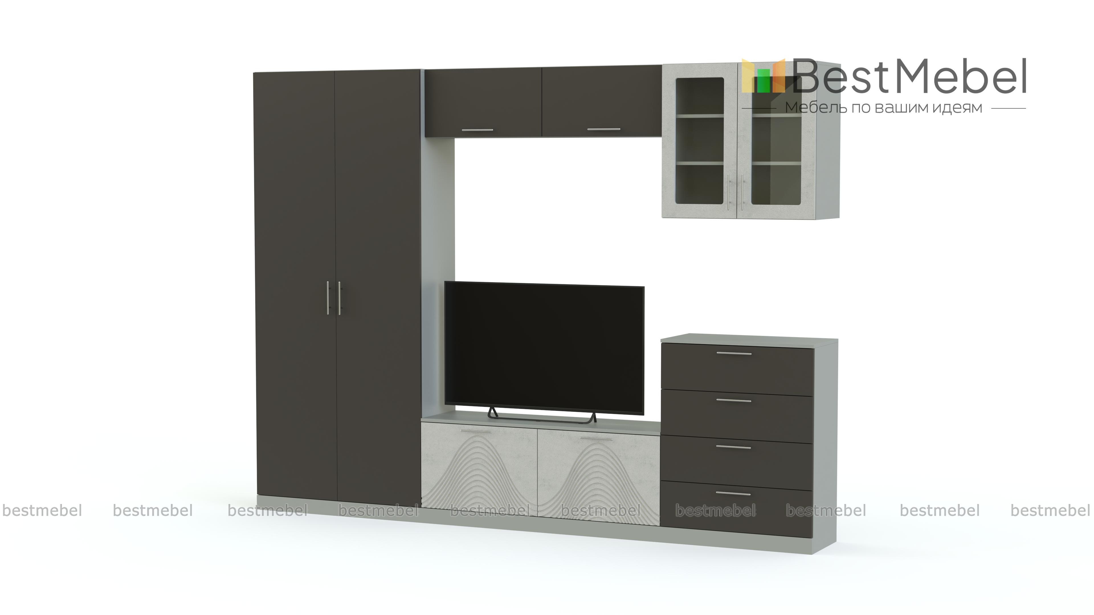 Стенка Вельвет 22 BMS – это вместительность, строгие минималистичные пропорции и свежие расцветки. Модель станет отличным выбором для создания яркого динамичного интерьера в современном стиле. Разместить все необходимое помогут практичные модули – платяной распашной шкаф, тумба под ТВ, комод с выдвижными ящиками, антресоль и навесной застекленный шкафчик. В оформлении фасадов сочетаются матовые гладкие поверхности и цветной оттенок с рельефным рисунком. Купить стенку Вельвет 22 BMS приглашаем по демократичной цене в наш интернет-магазин.