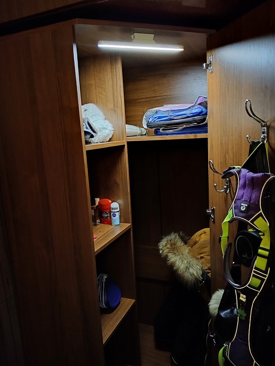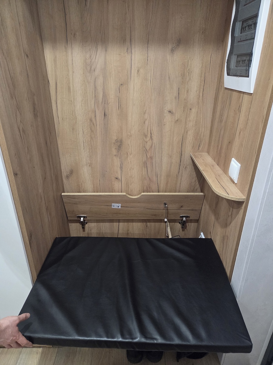 Шкаф красивый. Удобно, что можно заказать свой размер, выбрать комплектующие. Наша ошибка в выборе глубины шкафа: при расположении штанги в ширину и глубине 45 см "плечики" не умещаются. У нас крючок "плечиков" вращается, поэтому повесили чуть на искоса.