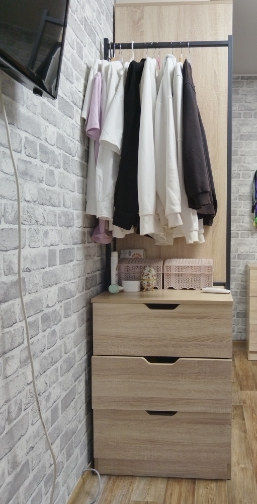 Очень стильный комод. Появилось дополнительное место для хранения одежды на штанге. Отлично вписался в интерьер. Спасибо