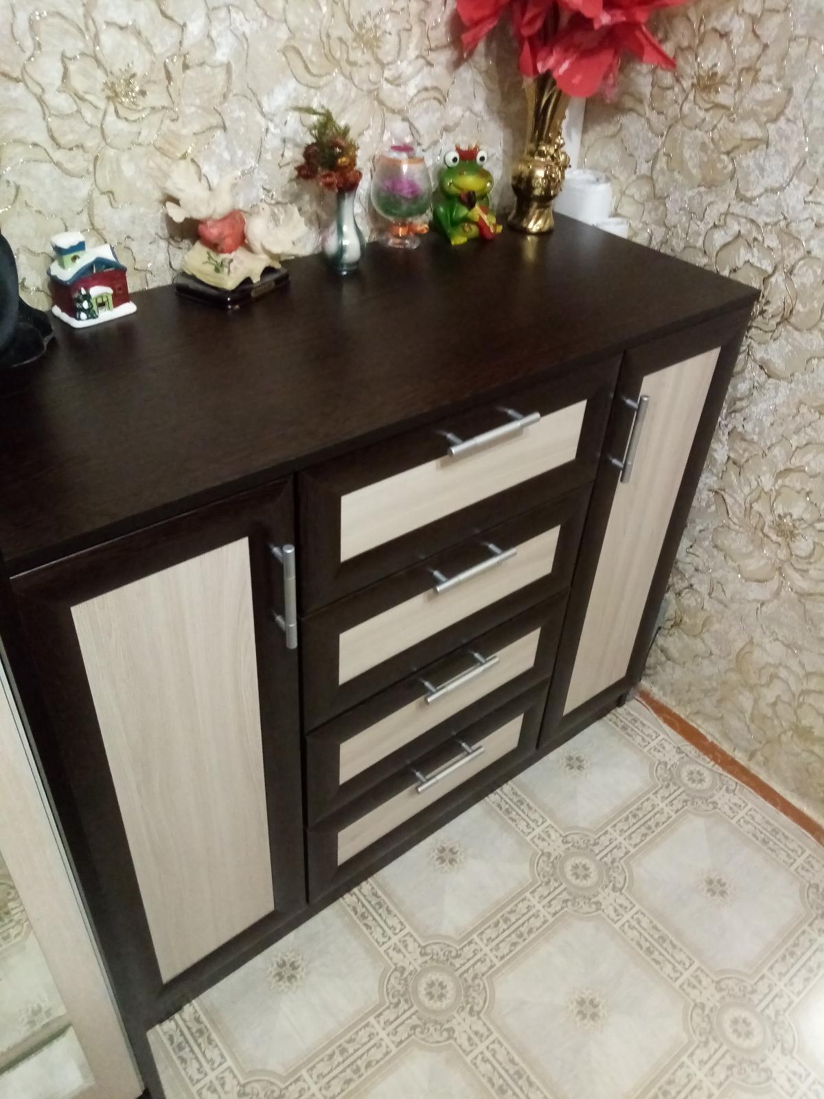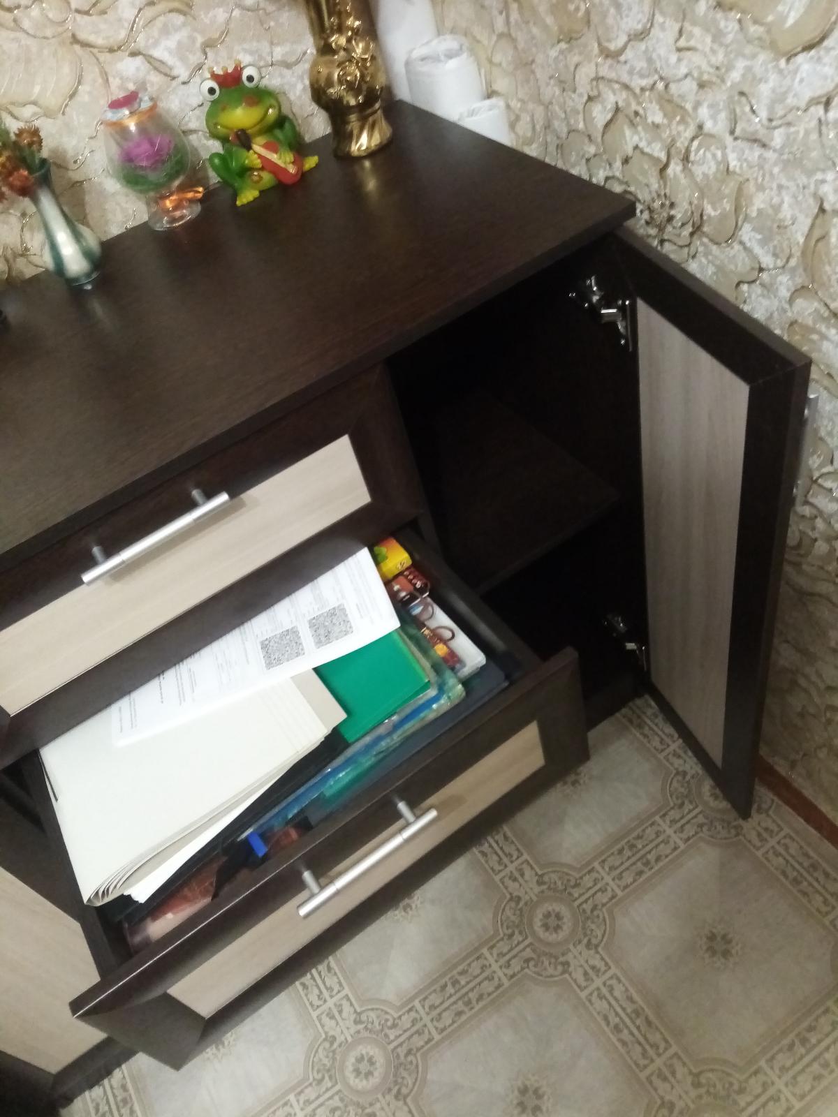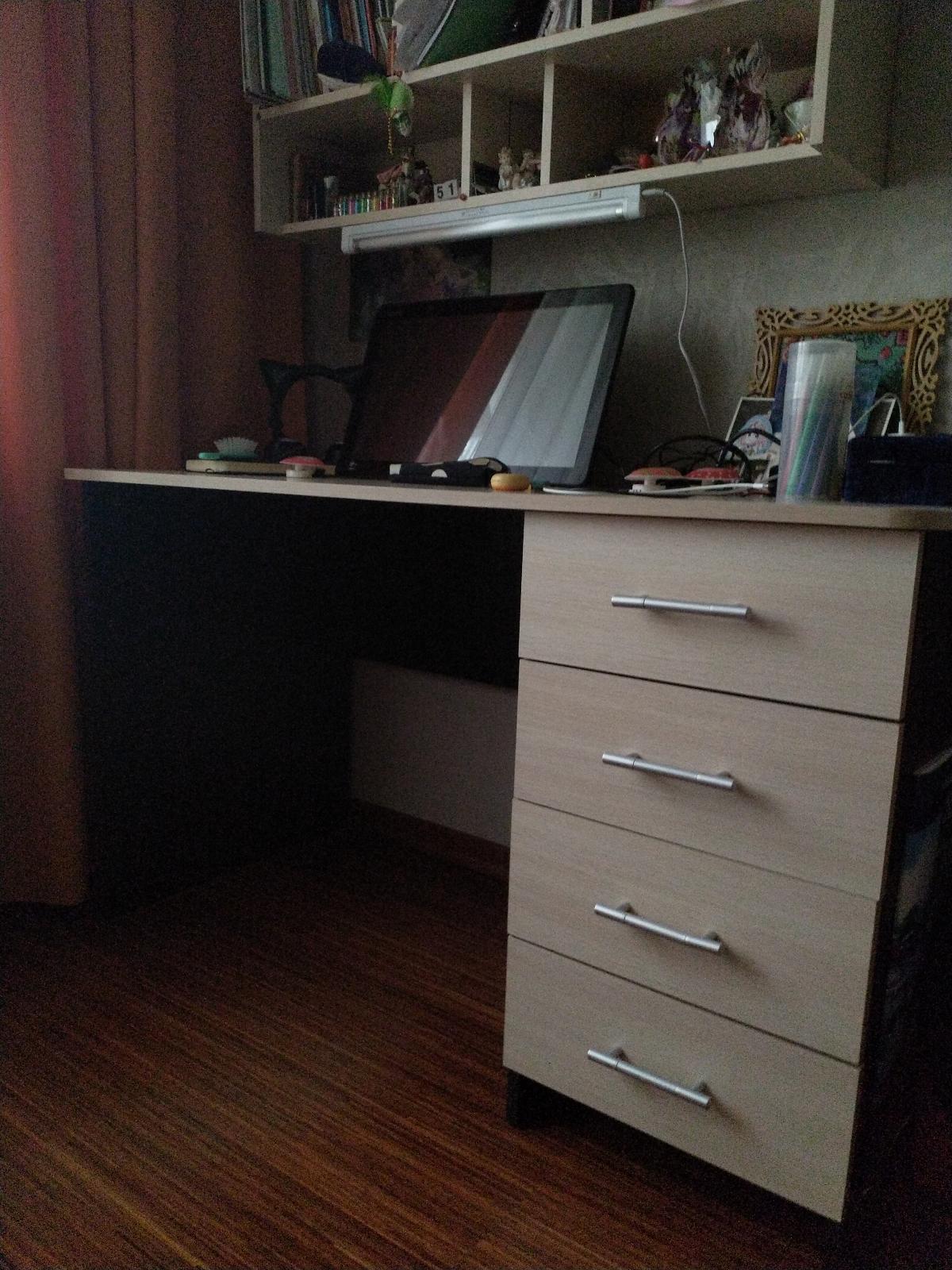 Заказывали стол по индивидуальному эскизу и полку над столом. Столешница утолщенная, радиусы сделаны отлично, качеством довольны. Сколов не было, фасады в защитной пленке. Сделали очень быстро, от момента заказа до доставки ровно неделя. Цвет корпуса дуб сомона, фасады белый глянец, рядом шкаф из икеи, цвет корпуса почти совпал, немного другая текстура, но практически не заметно. Собирали сами, сборка не сложная, не хватало нескольких отверстий для скрепления, муж решил вопрос с помощью дрели. Цена, качество и сервис оставили очень приятное впечатление. Спасибо