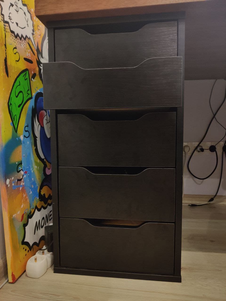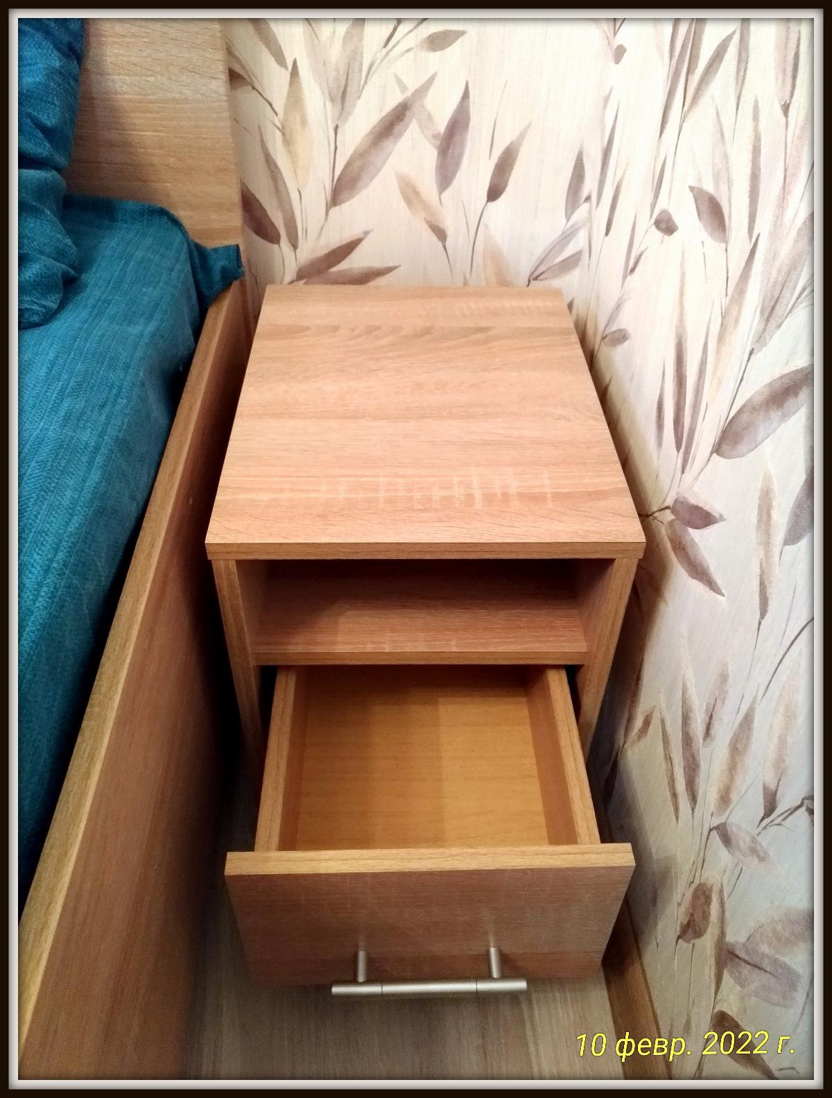 Заказали тумбочку, при заказе меняла цвет и размеры - очень радуют эти опции!!! Привезли через день! Но - оказалось, что обе боковые стенки - правые. Связалась с магазином, в течение недели проблему решили, довезли левую стенку. Но - она оказалась светлее на пару тонов остальных деталей. В процессе сборки обнаружилось, что некоторые отверстия просверлены неправильно. Не стали уже ничего писать/возвращать, ибо - это не критично, всё равно, видно не будет. Кстати, на фото видно, что ручка ящика низко, должна быть выше, именно из-за того, что неправильно просверлены отверстия. Но, в целом - качество хорошее, поэтому поставила везде 5 звёзд. Очень нравится магазин и возможность замены цвета и размеров.