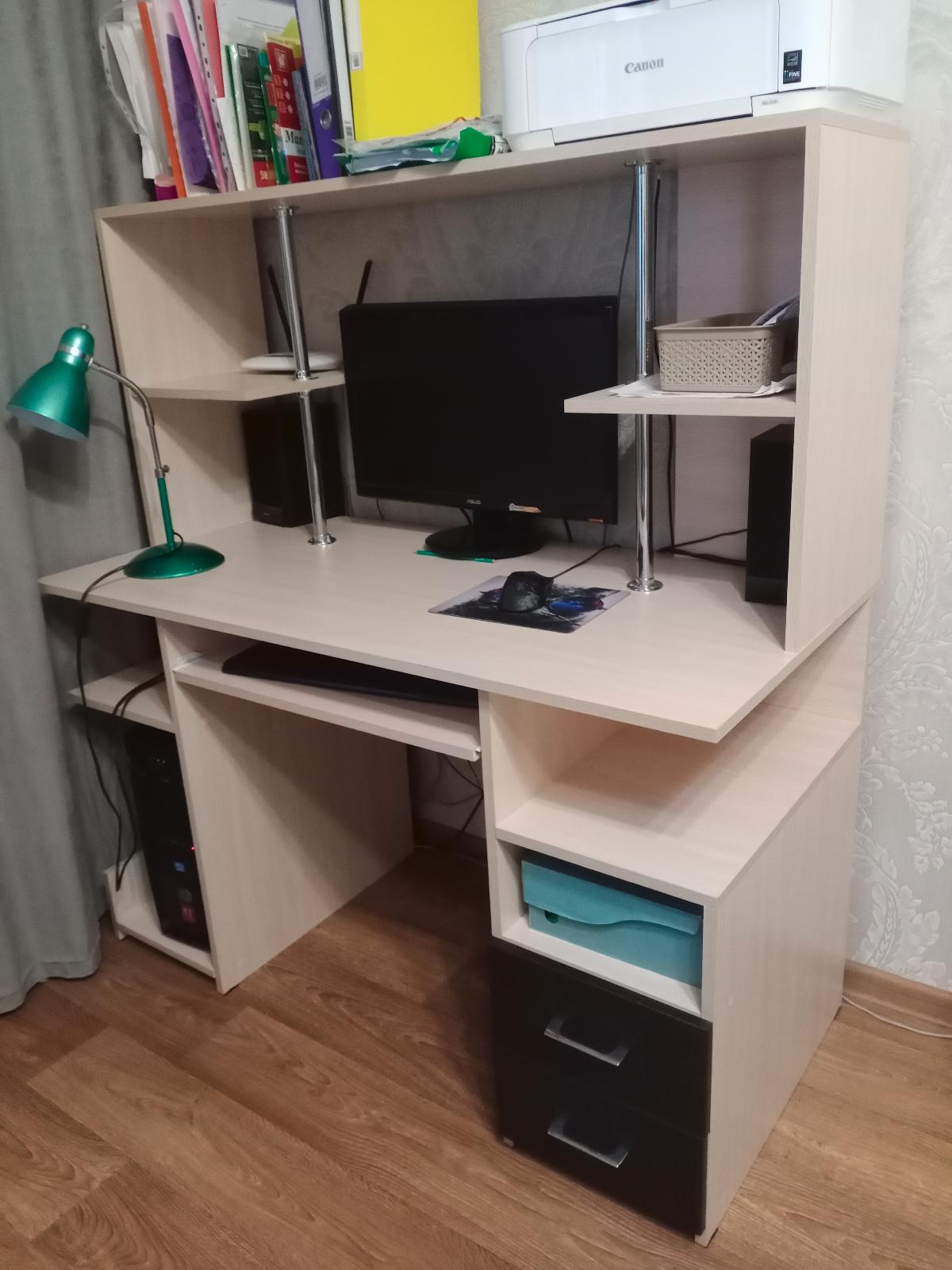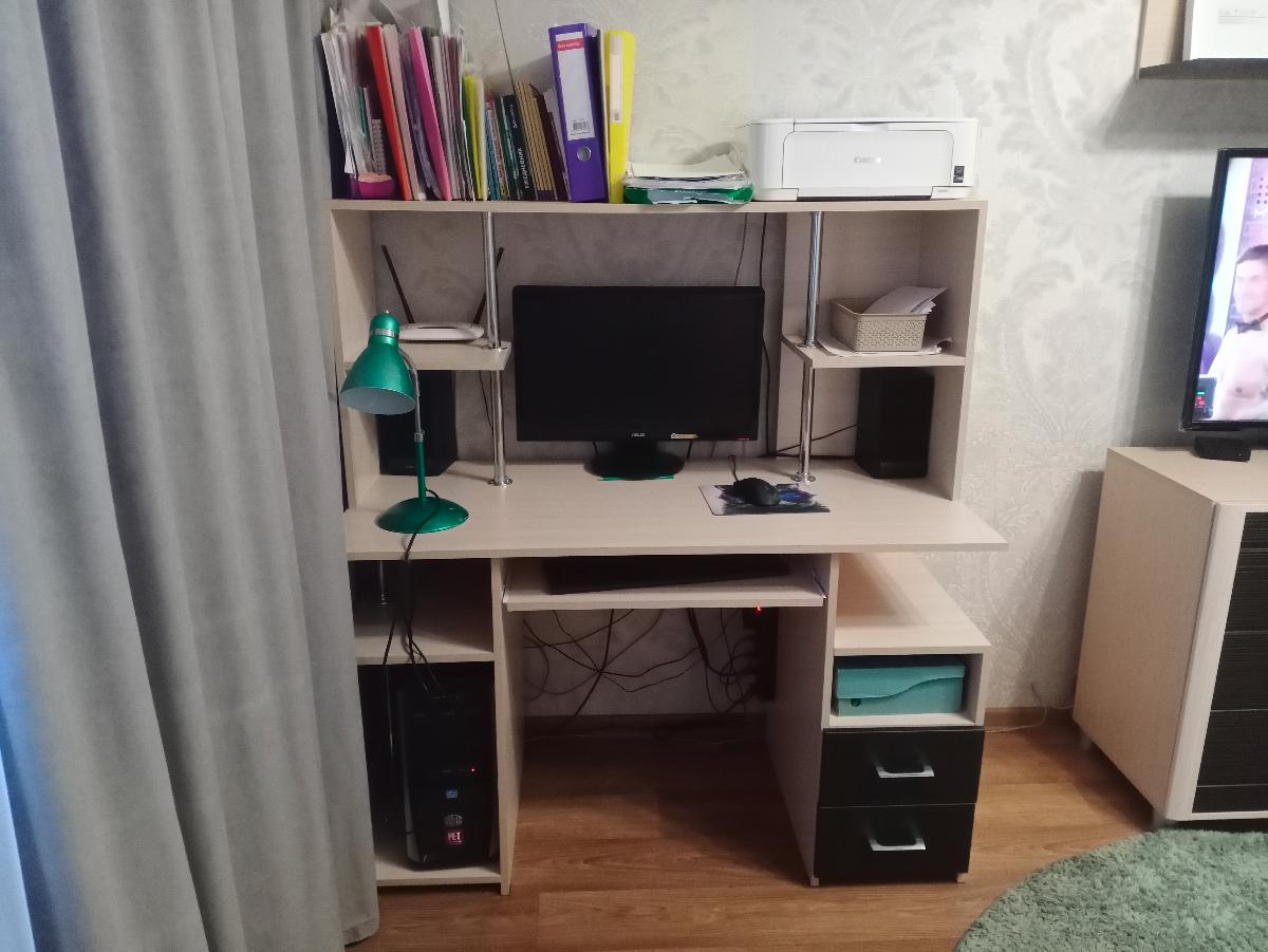 Давно искала компьютерный стол, на котором всё поместится ( в том числе и принтер и колонки), а главное, за которым ещё и можно полноценно писать. Кроме того подобрала цвет к уже ранее купленной в комнату мебели