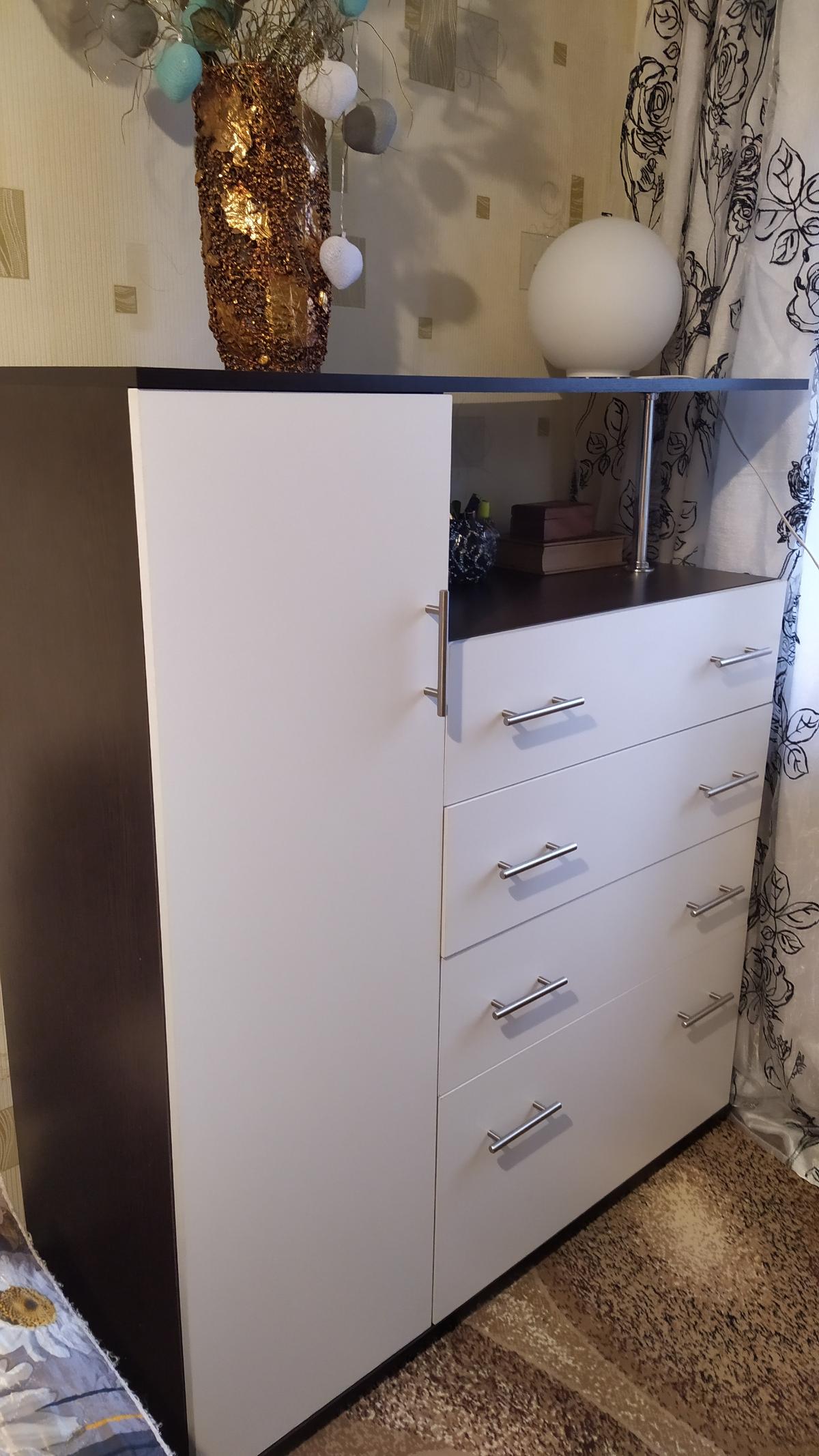 Покупала этот комод почти год назад. Большой плюс, что при выборе можно самому выбрать цвет, фурнитуру, материал по своему желанию и предпочтениям. Комод очень понравился, служит исправно уже почти год - нареканий нет. Собирали сами по схеме, пришлось повозиться, но результат порадовал. Совет - не экономьте сразу на фурнитуре, от нее зависит многое. В целом - рекомендую к покупке.