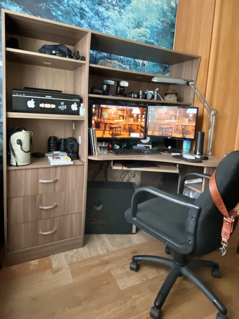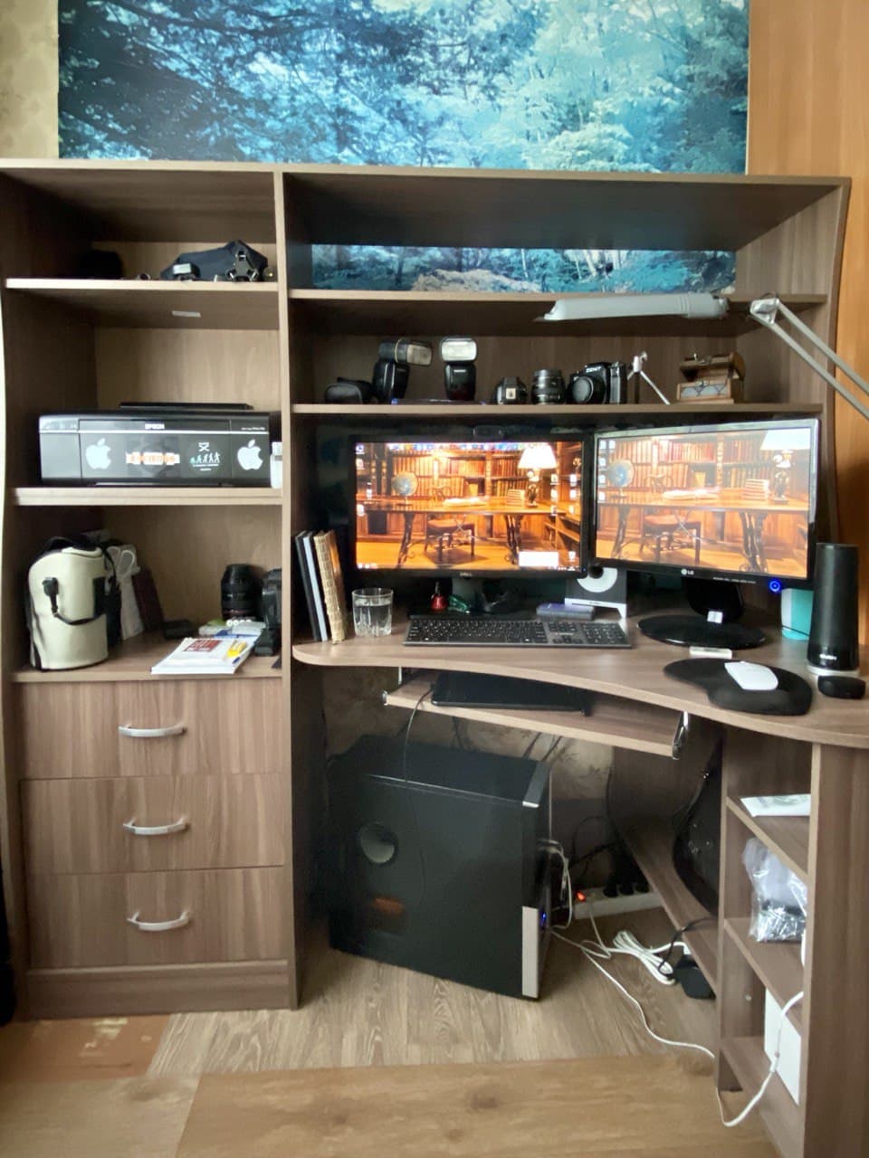 Стол выбирала из за функциональности и размера. Мне нужно было разместить 2 монитора и другую технику. Все уместилось и осталось место. На стеллажах можно разместить книги. Удобный, красивый. Собрали сами. Сложно, тк.много деталей, но возможно. Доставка сработала оперативно. После заказа привезли через 2 дня.Советую данный стол к приобретению.