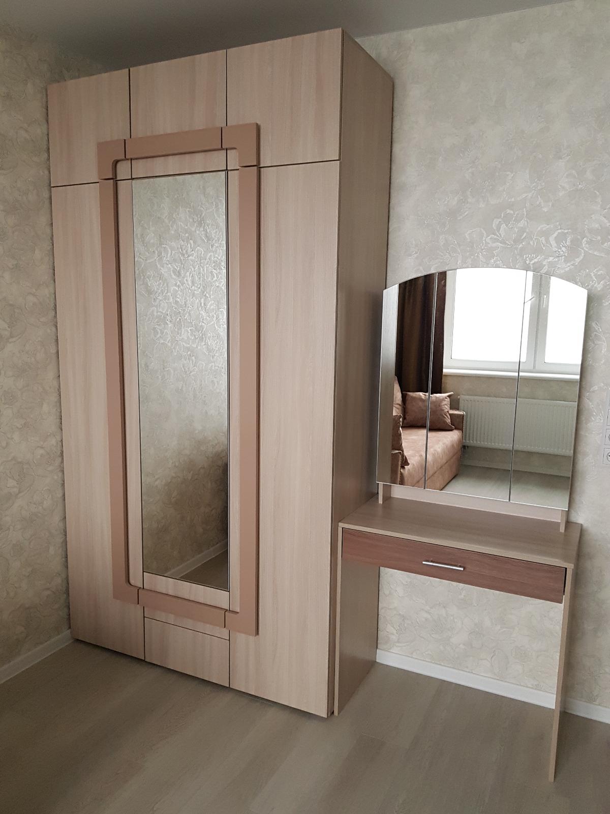 Шкаф очень понравился, особенно декоративная отделка в цвете Капучино Глянец 91050-3. Этот цвет вживую еще светлее, чем на моем фото, ближе к какао с молоком (с розовым оттенком). Я просто в восторге! Сам шкаф в цвете Ясень Шимо Светлый. Еще порадовало, что никаких выступающих ручек, декор имеет более узкую подложку и немного выступает, за него и открываются дверцы. У антресоли средняя дверца у меня открывается вверх, чтобы не было разрыва в декоре, который есть на схеме на сайте.  Рядом туалетный столик Ривьера.