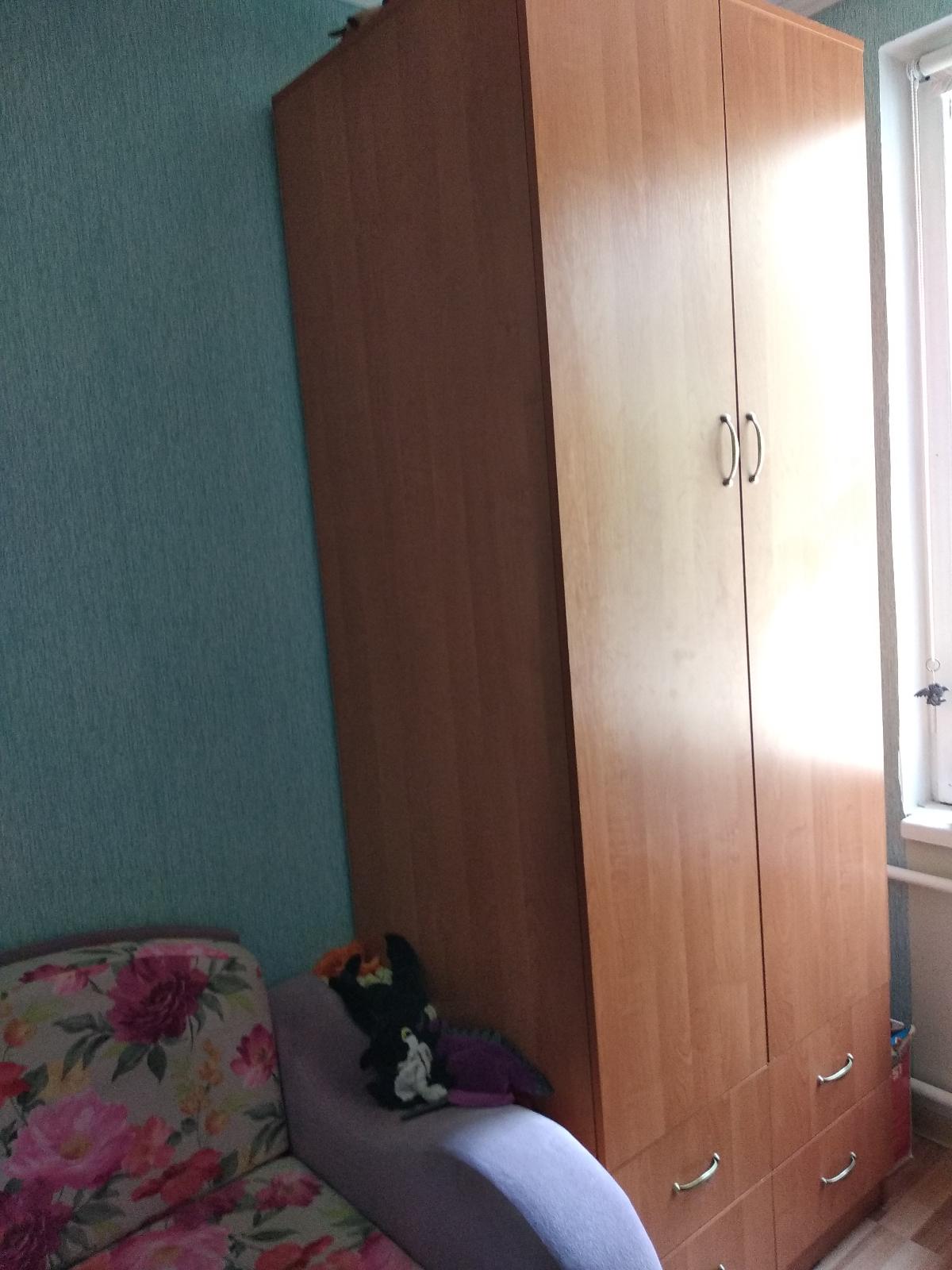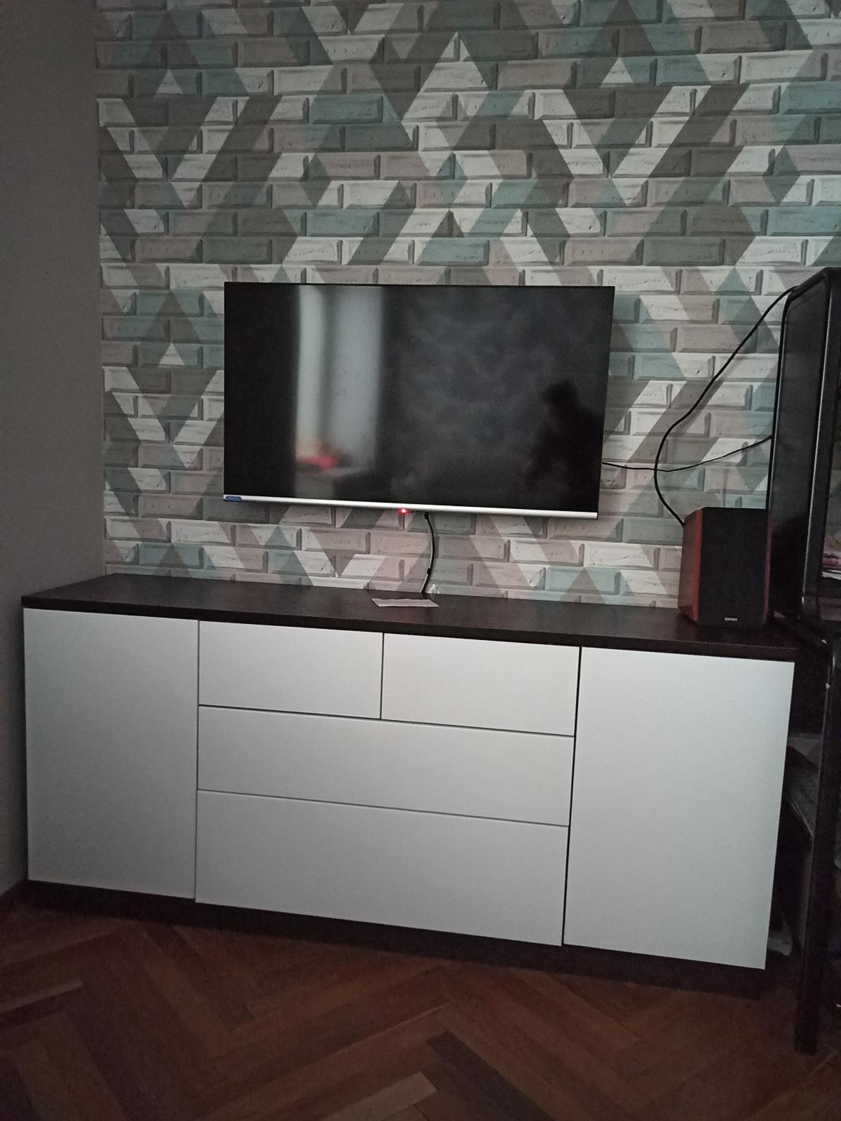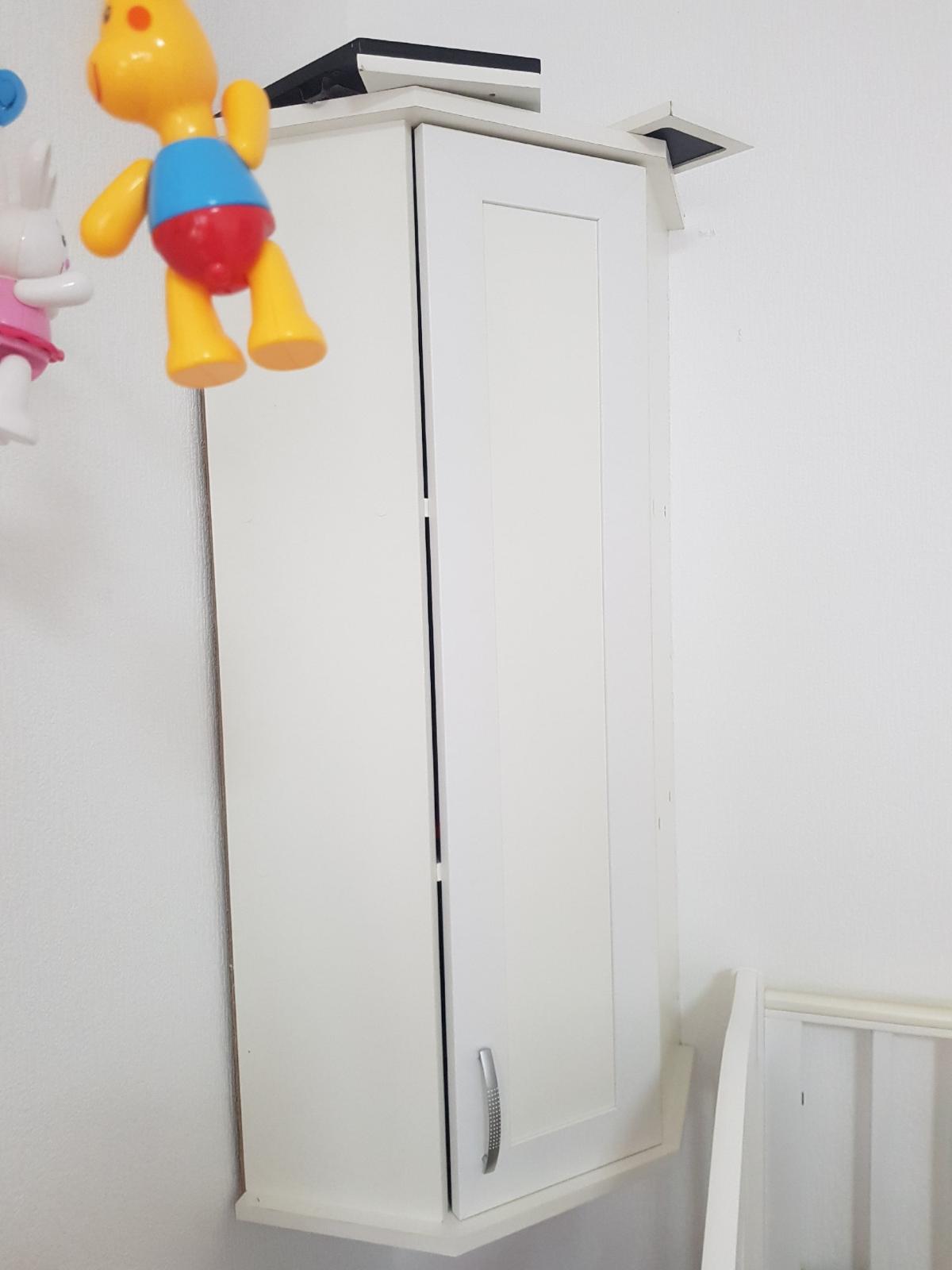 Шкаф нас удивил. Он оказался длинным и тонким (НЕ таким широким и коротким как на ваших картинках). Матового стекла в нем тоже нет. Он весь деревянный (или что там за материал). Мы думали хранить в нем папки, но они, конечно же, НЕ везли. В итоге мы приспособили его под детские вещи и, в целом, довольны. Смотрится стильно, как видите на фото (сверху лежит рамочка, не обращайте внимания). Убираться очень удобно, когда мебель висит. Благодаря вашей компании столы у нас тоже навесные и мы счастливы)
