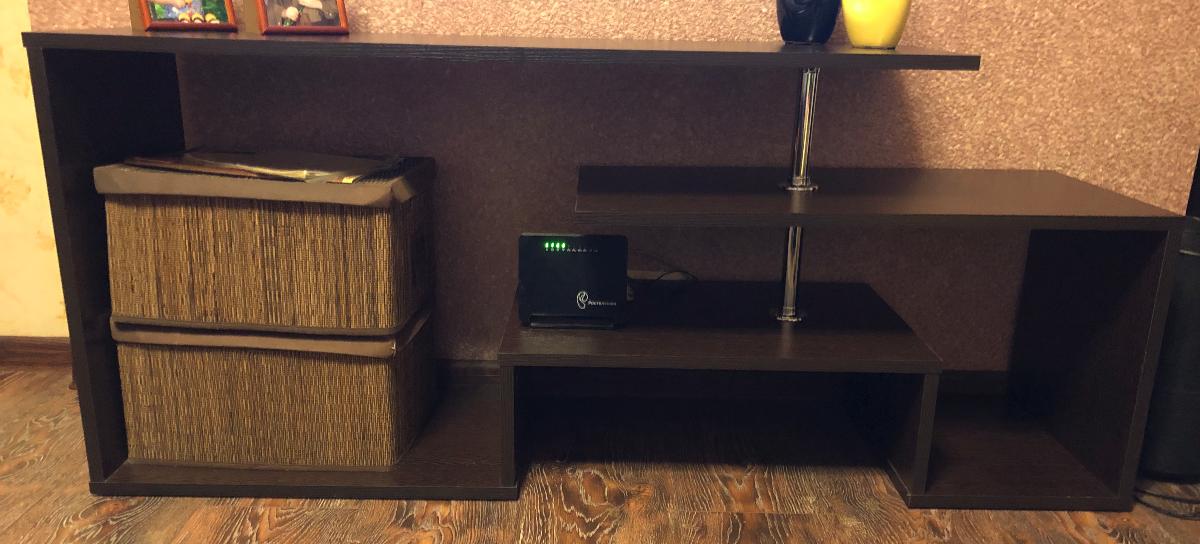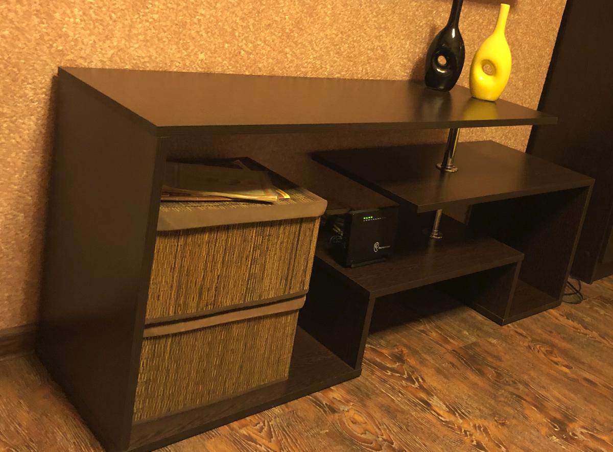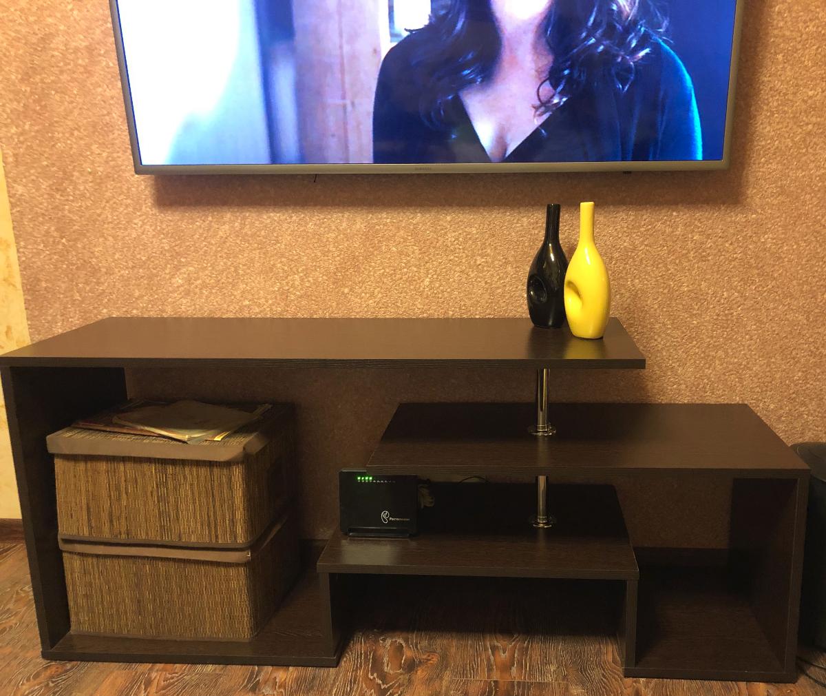 Заказала тв тумбу по приемлемой цене, Внешне на мой взгляд очень стильная , доставка быстрая, муж собрал сам инструкция на доступном языке, по качеству очень хорошая, используем около полугода проблем ни каких нет, стоит и радует нас!