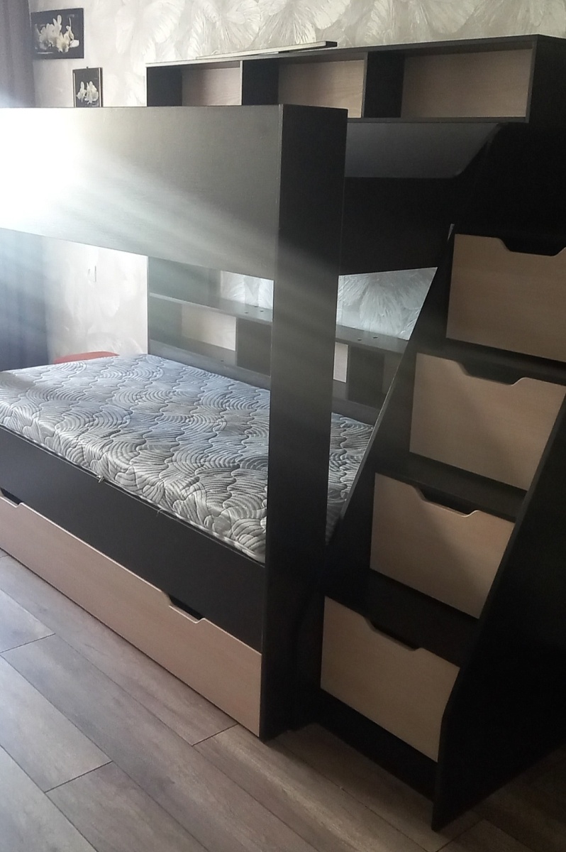 Кроватью довольны. Пользуемся уже 7 мес. За это время существенных замечаний нет.  Очень удобно и практично нижний выдвижной ярус. Очень приятно,что при оформлении заказа учтены все предпочтения клиента. Отдельная благодарность консультантам (перезванивали несколько раз, чтобы уточнить все мелочи) и доставке. Заказ доставили в срок и полностью укомплектованным.Из минусов - инструкция по сборке практически нечитаема. Цифры совсем не разобрать. Сами собрать не смогли, приглашали специалиста по сборке мебели.
