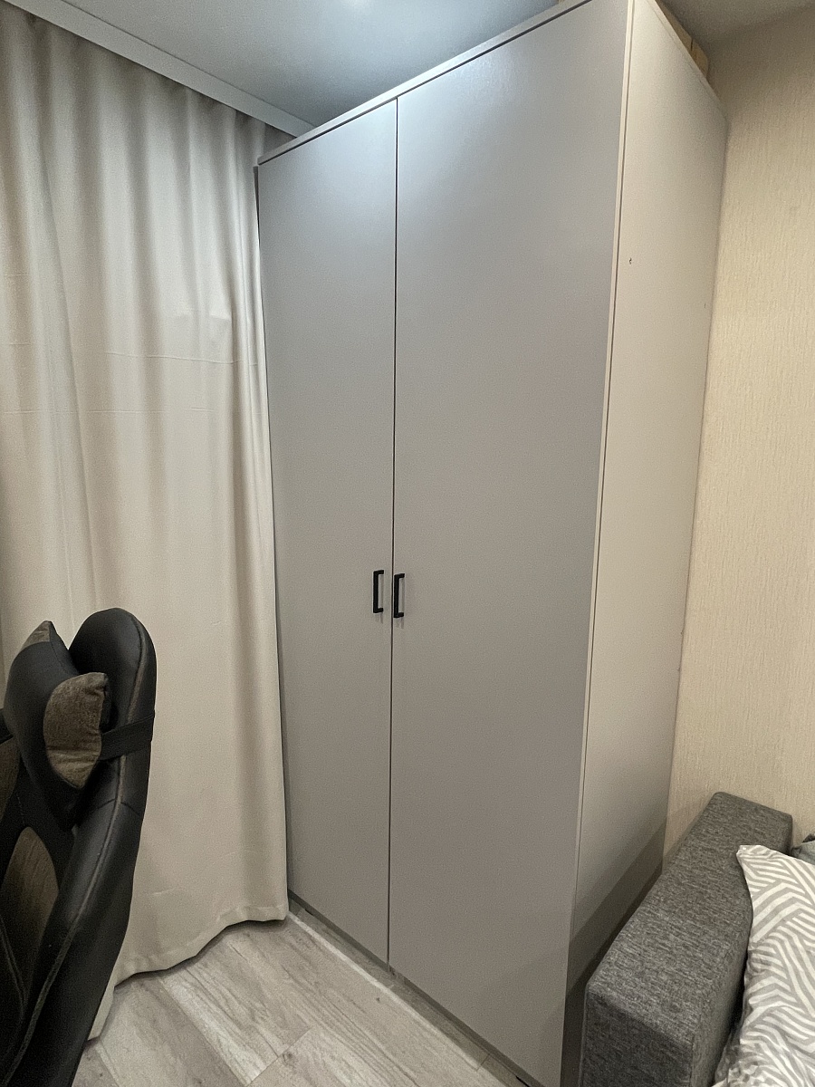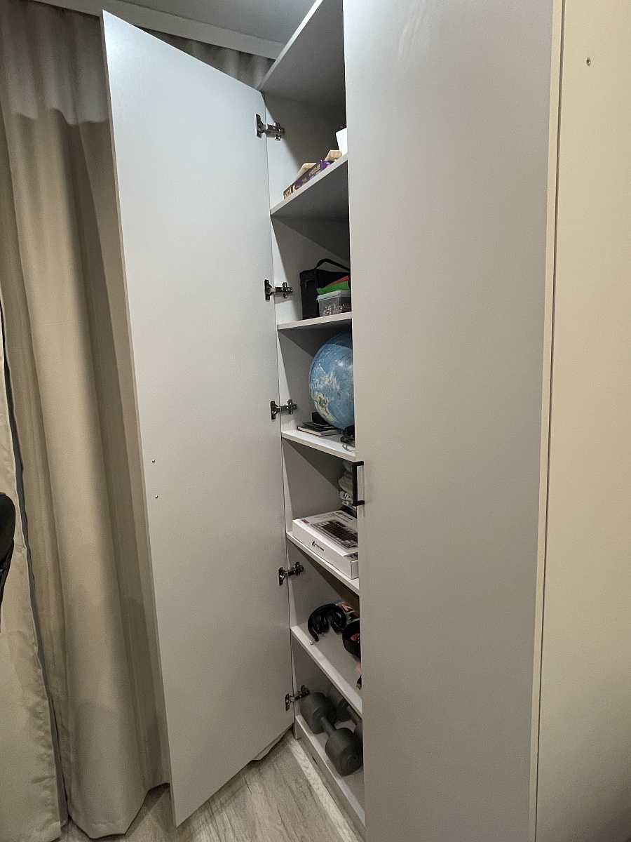 Заказ номер 952753.Отличный шкаф! Дополнили его боковыми полочками. В квартире-студии идеальный вариант! Особенно, когда вымеряешь всё по миллиметрам. Фурнитура качественная - двери с зеркалами достаточно тяжелые, но за несколько лет использования никаких проблем не возникло. Пятерка по всем параметрам!